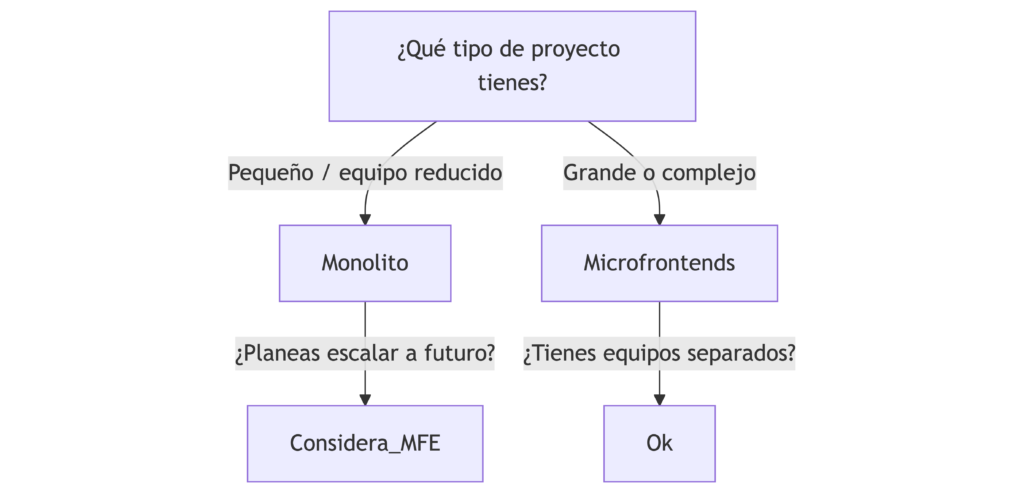 Mi consejo: empieza por un microlito si estás arrancando. Minimiza el Time To Market. Y si la cosa crece, ahí sí, divide por dominios funcionales y apuesta por los microfrontends.
